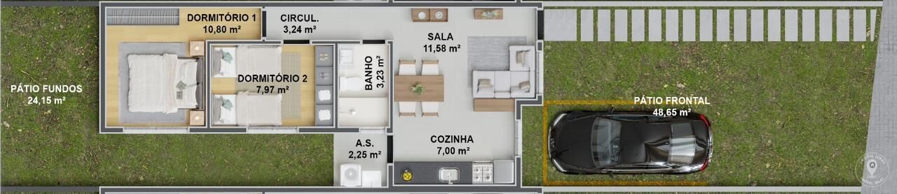 Pátio amplo na frente com espaço de garagem, e pátio nos fundos para sua privacidade, sala e cozinha integrados, área de serviço, quarto de casal e de solteiro.